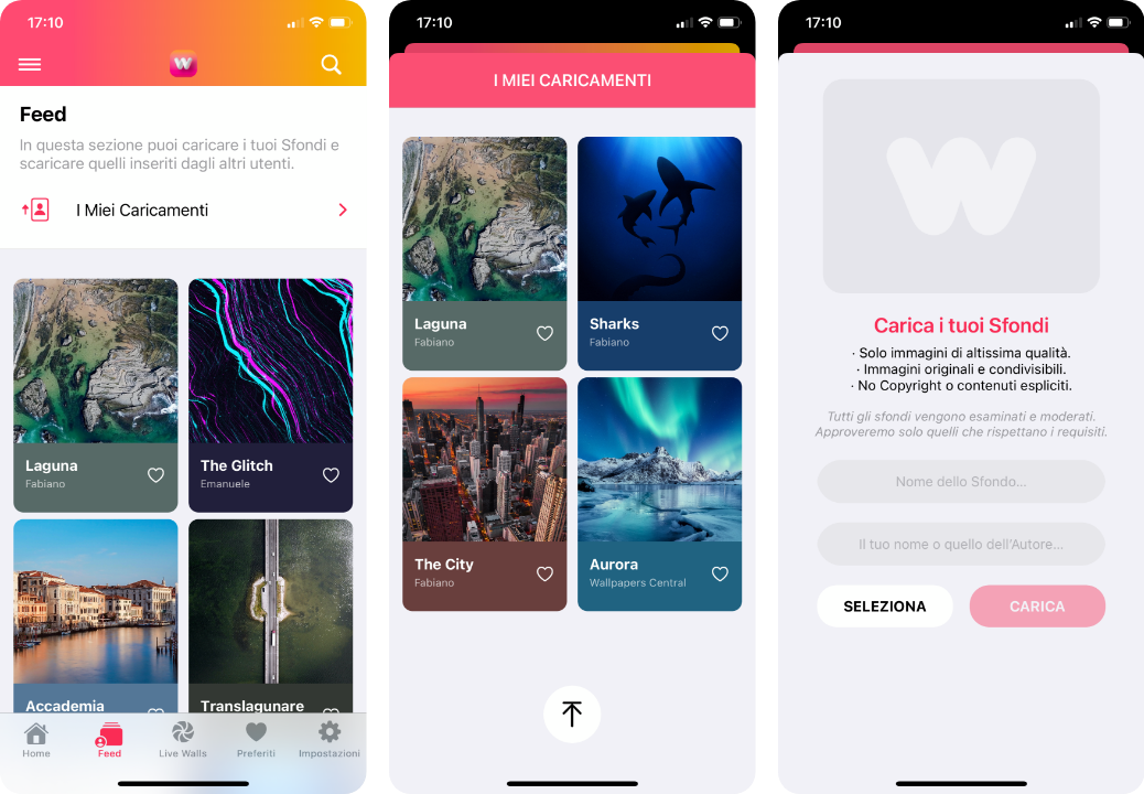 - FEED: A really powerful and very interesting section that allows you to download new wallpapers uploaded directly by other app’s users (from all over the world!). Yes, with this application we give you the opportunity to upload your original wallpapers, your perfect photos or artworks. We will manually review and moderate all the wallpapers and we will approve only the highest quality ones, according to our Terms of Use.